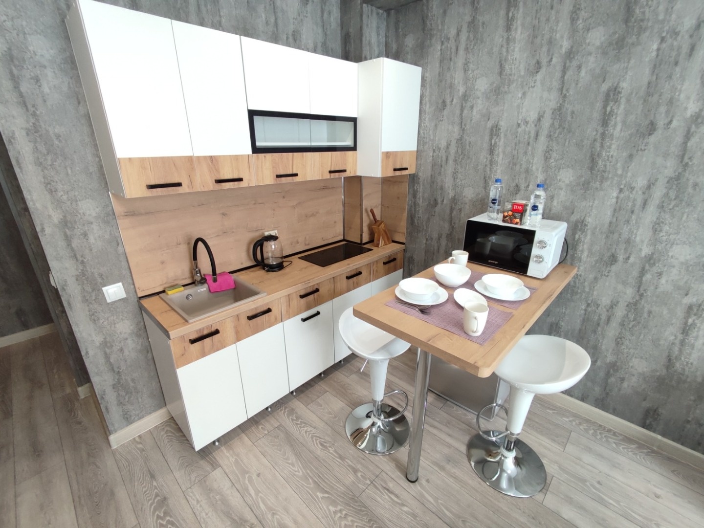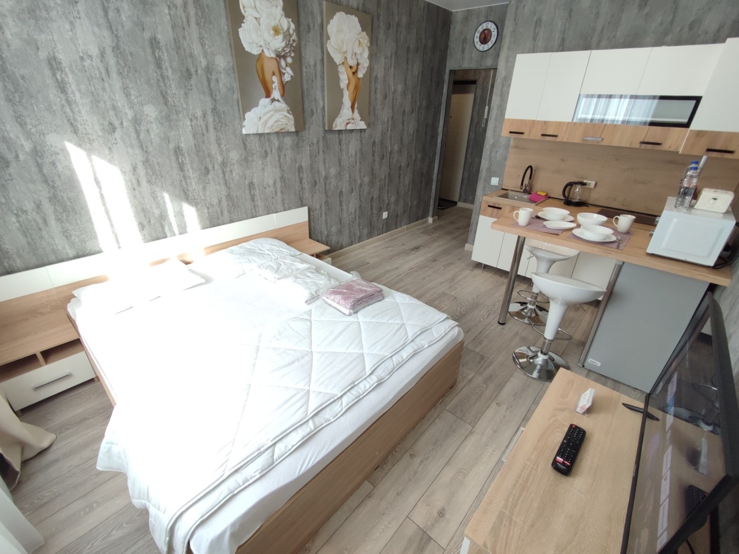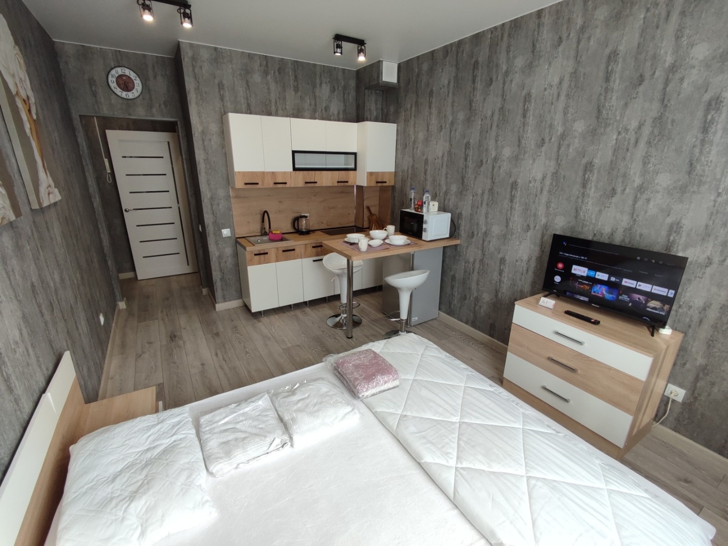 Мы позаботились обо всем: в студии выполнен полностью качественный ремонт с использованием керамогранита в санузле, высокопрочного ламината и современной отделки. Вам не придется ничего докупать — вся мебель и техника, вплоть до утюга и телевизора, остаются новым владельцам!